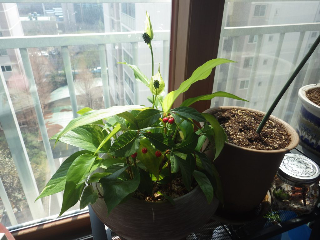 엄마가 두고가신 화분의 스파티필럼도 계속 꽃대를 올리고 있다.